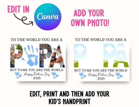Editable Father’s Day Handprint Printable – “To the World You Are a Papa” | Custom Photo & Handprint Art | Instant Download | Canva Template