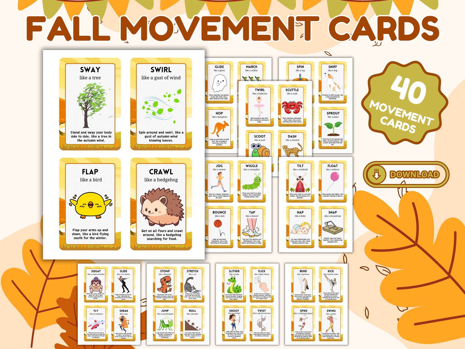 Get kids moving and giggling with these 40 Fall-Themed Movement Cards! Each card has a fun action prompt like “Sway like a tree,” “Hop like a squirrel,” or “Spin like the wind.” Perfect for getting the wiggles out indoors or outside.